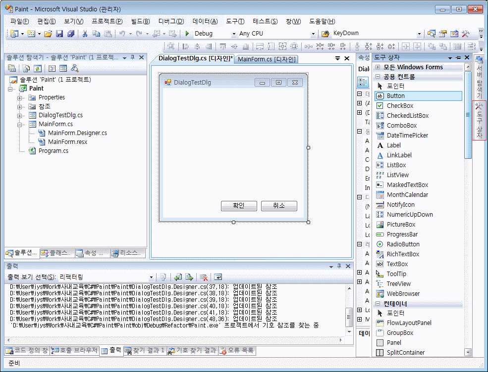 DialogTest.cs를 열어(디자이인 모드) 도구상자에서 Button을 마우스로 드래그 & 드롭을 합니다. 속성에서 Text를 확인으로 수정하고, (Name)을 buttonOK로 수정합니다. 같은 방식으로 버튼을 하나더 추가하여 Text를 취소로, (Name)을 buttonCancel로 수정합니다.
