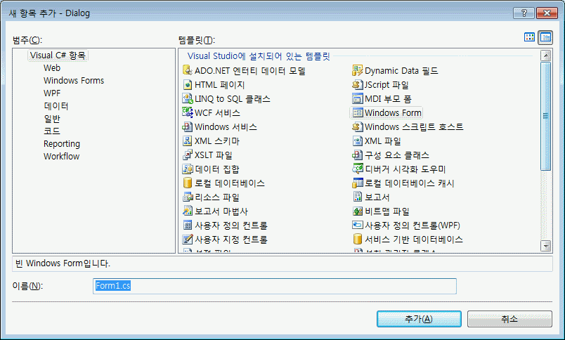프로젝트 명에서 우측버튼을 선택하여 생성된 메뉴에서 추가의 부메뉴 Windows Form을 선택하면 다음과 같은 대화 상자가 생성됩니다.