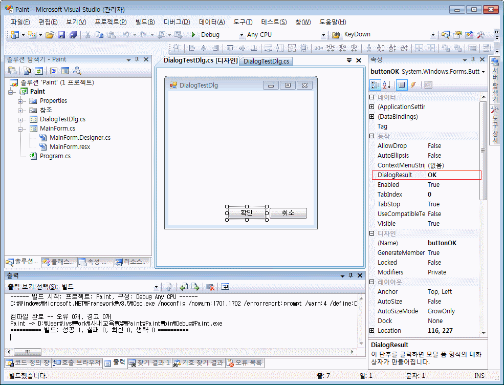 우선 DialogResult.OK를 리턴하고 종료하도록하는 것이 확인 버튼의 속성에서 DialogResult를 OK로 선택하고, DialogResult.Cancel을 리턴하고 종료하도록하는 것이 취소 버튼의 속성에서 DialogResult를 Cancel로 선택합니다.