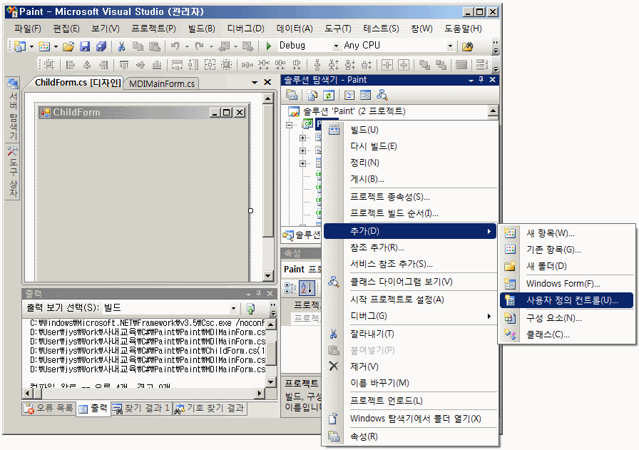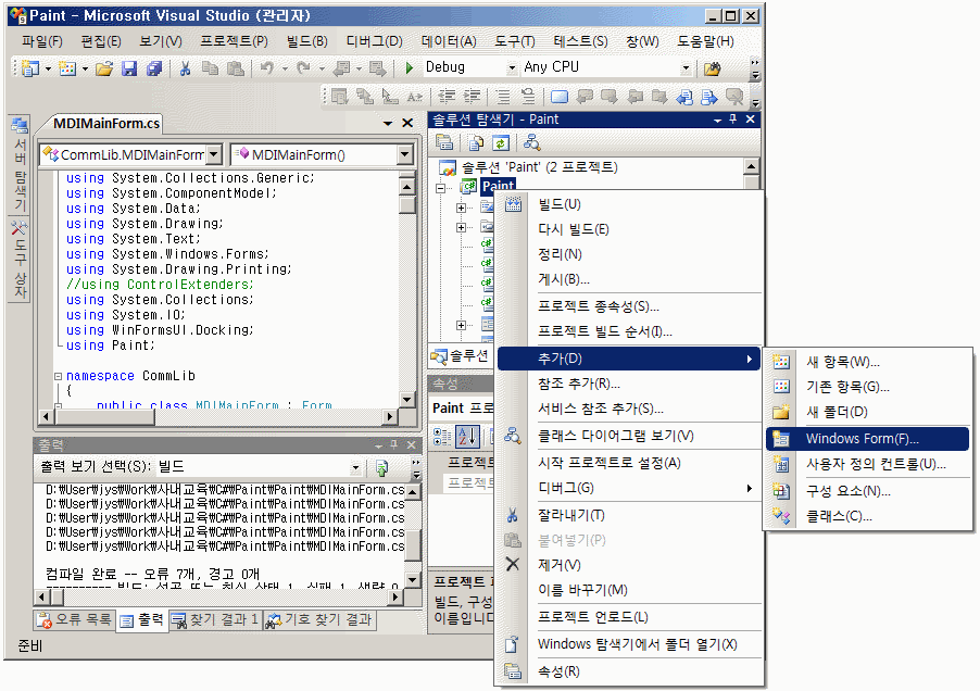Paint 프로젝트에 아래와 같이 Windows Form을 추가하여 ChildForm으로 만듭니다.