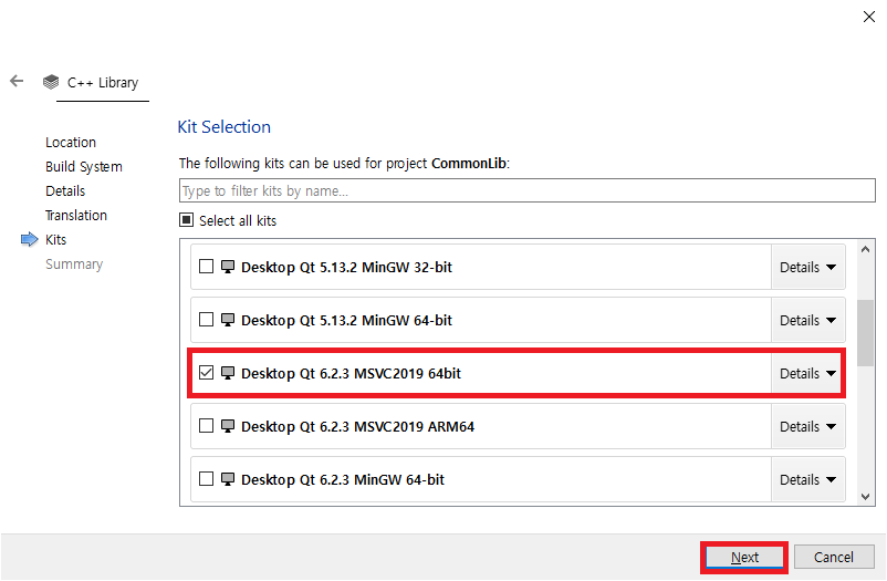 Desktop Qt 6.2.3 MSVC2019 64bit를 체크하고 Next를 선택하면 다음과 같이 화면에 나타납니다.