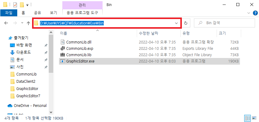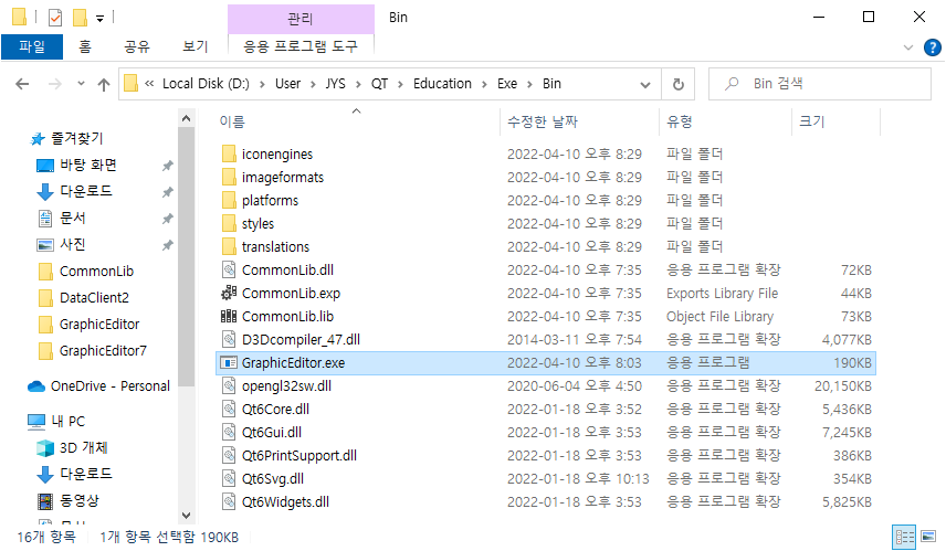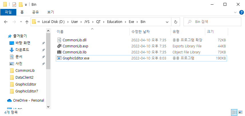 컴파일을 하면 dll(CommonLib) 파일과 exe(GraphicEditor) 파일이 별도의 폴더에 생성이 됩니다.