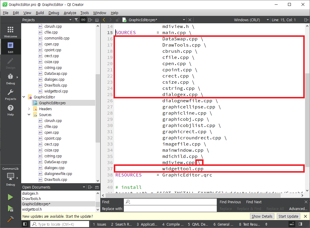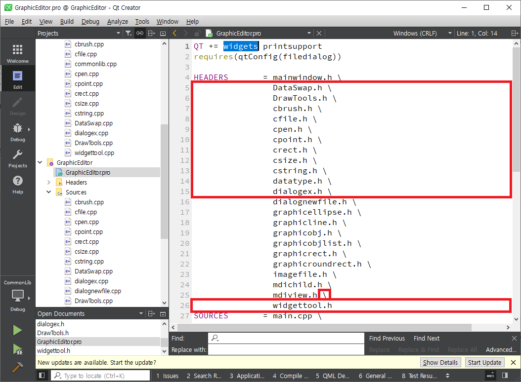GraphicEditor.pro를 열어 HEADERS에서 DLL로 만든 파일들을 모두 삭제합니다.