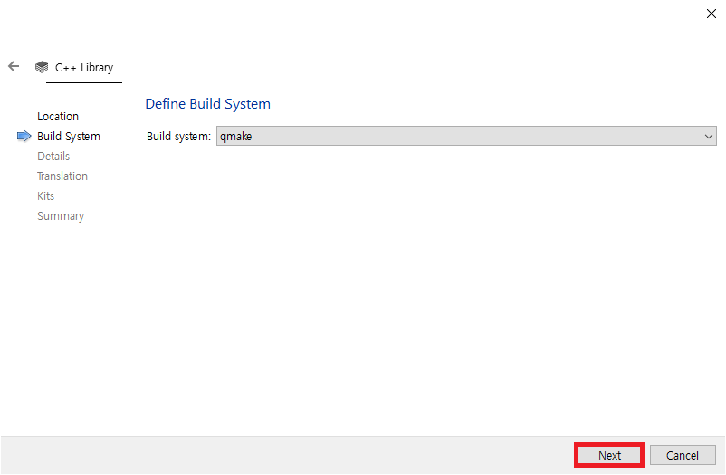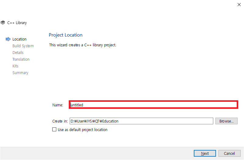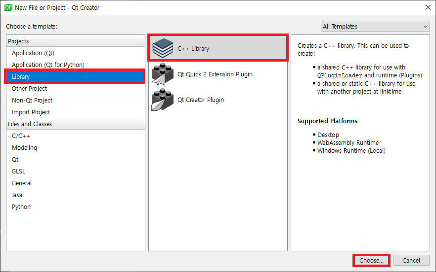 Projects를 Library로 선택 후 C++ Library를 선택하고 Choose...를 선택하면 다음과 같이 화면에 나타납니다.