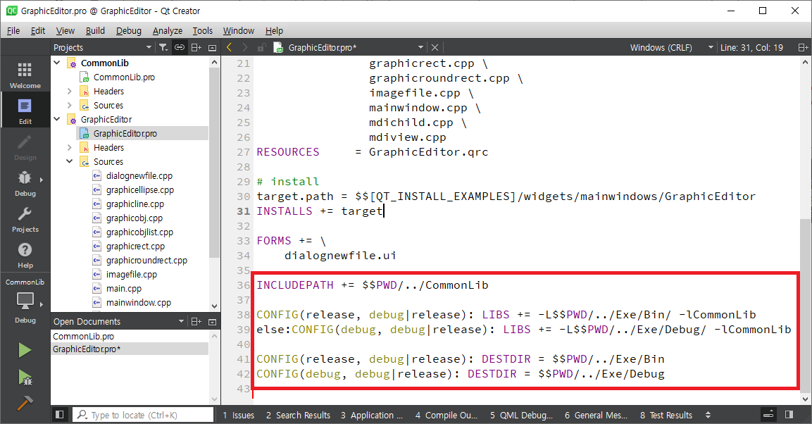 CommonLib.pro 파일을 열어 제일 아래 쪽에 아래와 같이 두줄을 입력합니다.