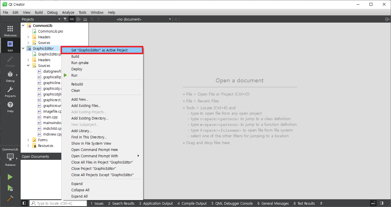GraphicEditor에서 마우스 오른쪽 버튼을 클릭하여 생성된 팝업 메뉴에서 Set "GraphicEditor" as Active Project를 선택하면 GraphicEditor 프로젝트가 Active됩니다.