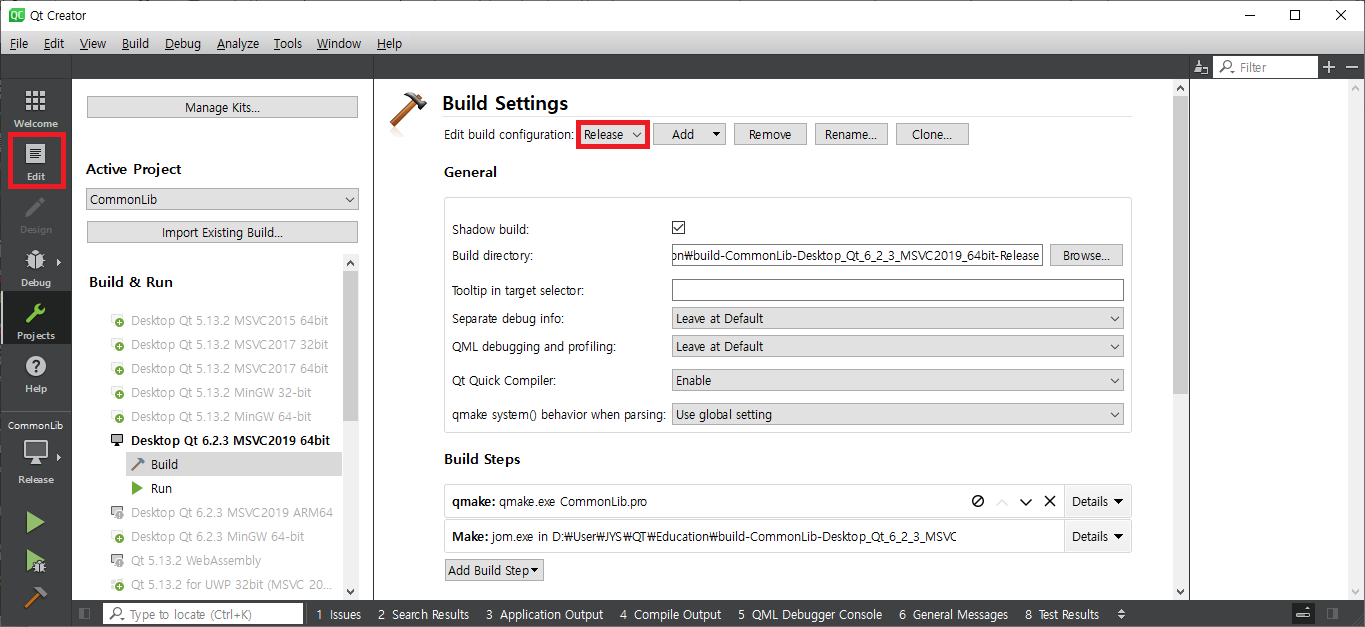 Edit를 클릭하여 Build를 하면 CommonLib가 Release로 컴파일이 됩니다.