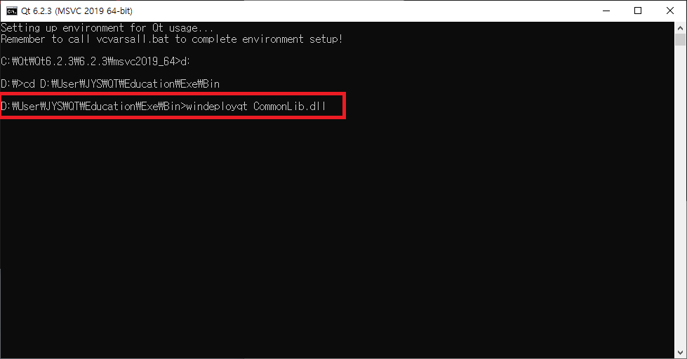 windeployqt CommonLib.dll을 입력하고 Enter키를 누릅니다.