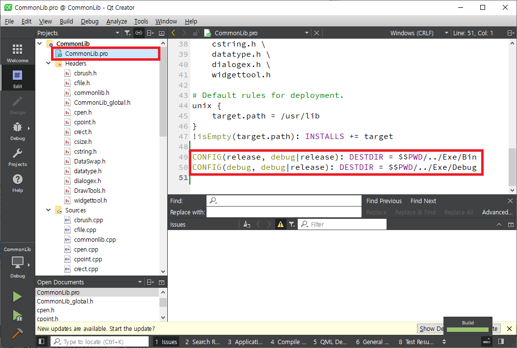 #CommonLib 에서와 같이 Exe 폴더를 두고 release 버전은 Bin 폴더에 Debug 버전은 Debug 폴더에 생성하도록 목적지 폴더(DESTDIR)를 설정합니다.