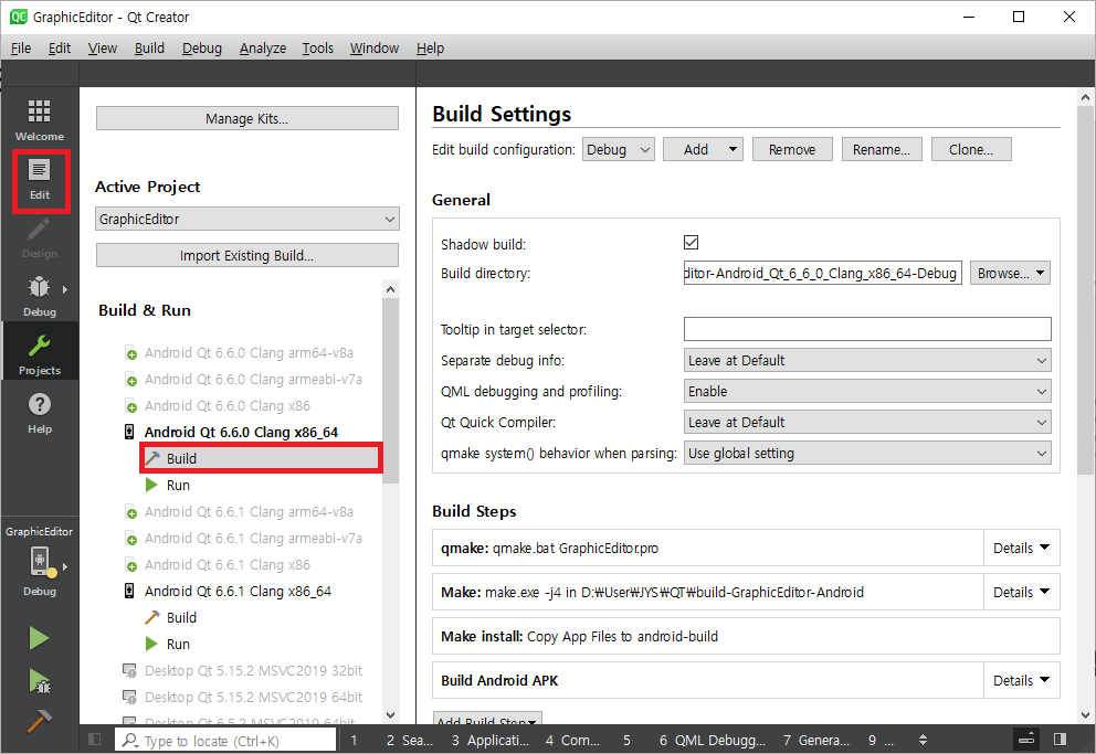 Android Qt 6.2.3 Clang x86_64 아래 Build를 마우스로 클릭하면 안드로이드용으로 컴파일 하도록 설정이 됩니다.