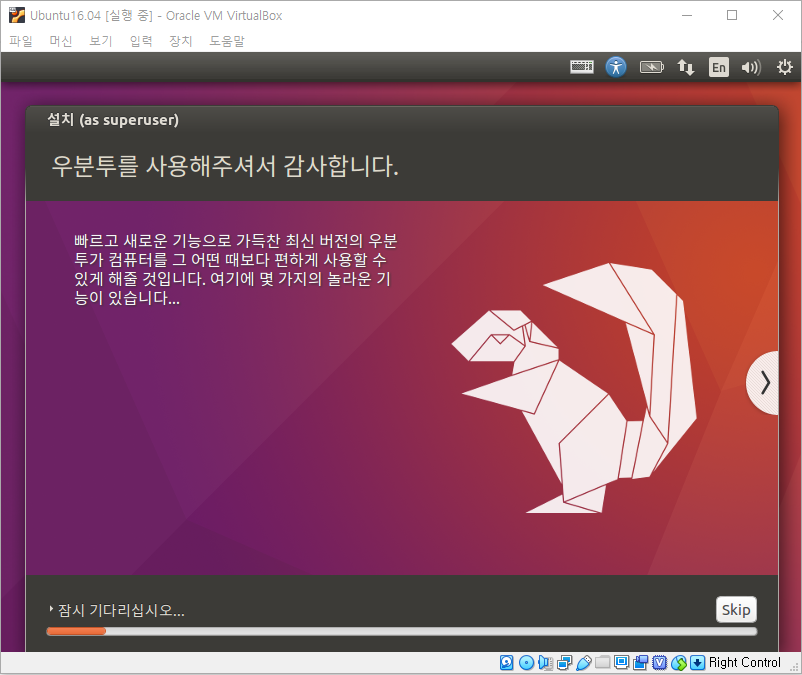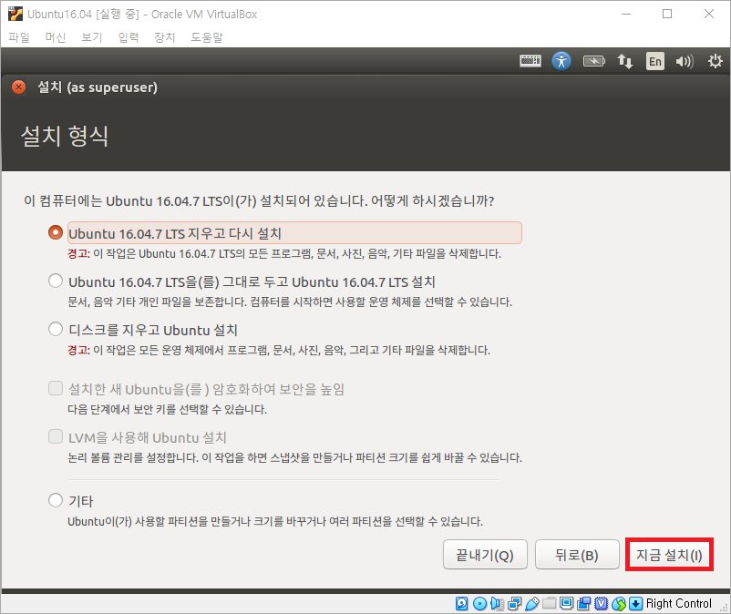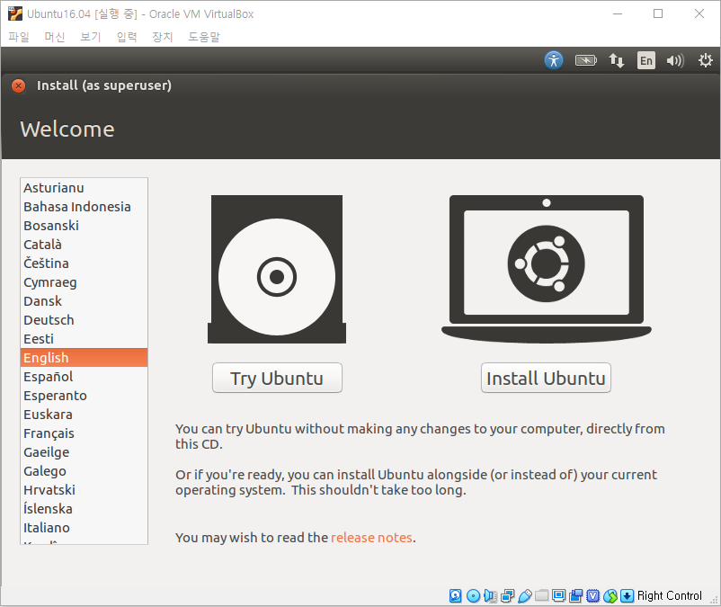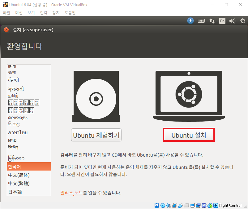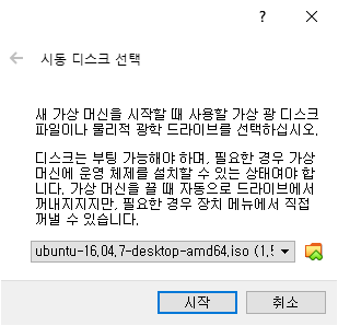 ubuntu-16.04.7-desktop-amd64.iso 파일을 선택하고 열기를 누르면 다음과 같이 화면에 나타납니다.