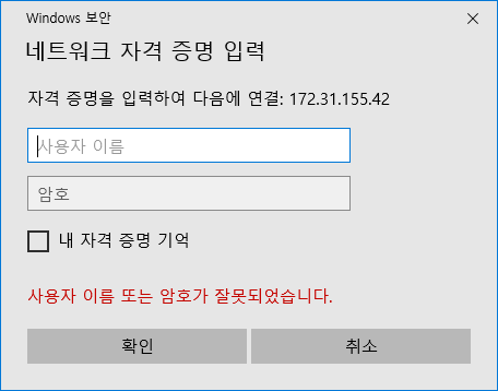 탐색기를 실행하여 주소표시줄에 우분투에 할당된 IP인 \\192.168.0.180를 입력하고 Enter를 누르면 다음과 같은 대화상자가 생성되어 사용자 이름과 암호를 입력하면(samba에 설정한 사용자 이름과 암호) 공유된 폴더를 Access할 수 있습니다.