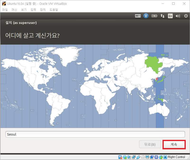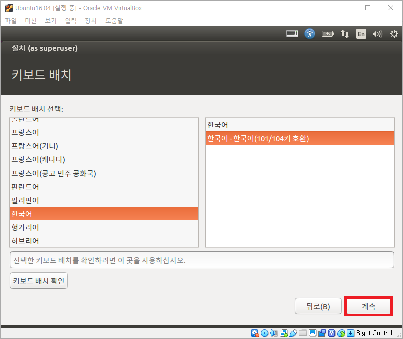 계속을 클릭하여 나타난 화면에서 키보드 배치를 한국어/한국어-한국어(101/104키 호환)을 선택합니다.