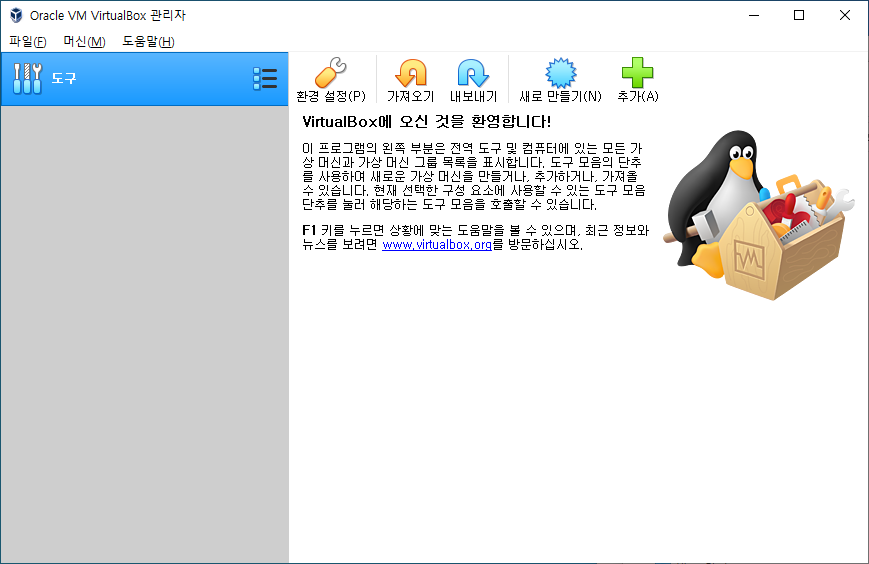 Oracle Virtual Box를 설치하고 실행하면 다음과 같이 화면에 나타납니다.
