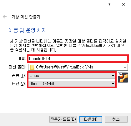 다음과 같이 이름에 Ubuntu16.04를 입력하고, 종류에 Linux, 버전에 Ubuntu (64-bit)를 선택합니다. 참고로 최신 버전의 Ubuntu는 안되는 것이 있어 16.04로 설치했습니다.