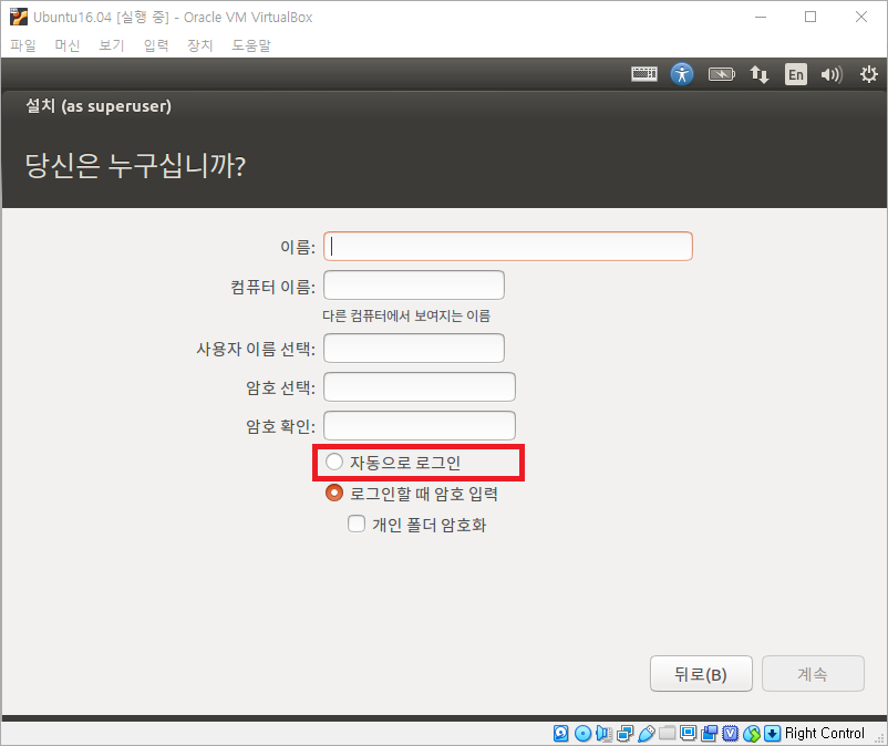 이름, 컴퓨터 이름, 사용자 이름(Linux 개발 환경을 구축하여 RK3288 보드용 개발을 수행하고자 하는 경우 폴더 위치 관계로 jys로 입력해야 컴파일 환경 구축이 가능합니다), 암호를 입력하고, 자동으로 로그인(VirtualBox에 설치할 경우 이미 Windows에서 로그인하여 들어왔으므로 특별한 보안이슈가 없다면 자동으로 로그인 설정)을 선택한 후 계속을 선택하면 다음과 같이 화면에 나타나며 설치가 됩니다.
