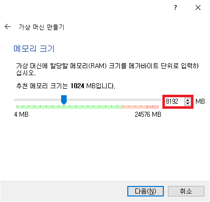 8GB정도 할당하면 좋으나 설치하는 컴퓨터의 메모리가 작을 경우 컴퓨터 메모리의 반만큼 할당합니다.