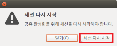 세션 다시 시작을 눌러 공유 폴더가 정상적으로 화성화 되도록 합니다.