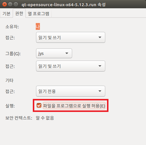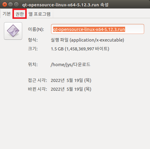 qt-opensource-linux-x64-5.12.3.run에서 마우스 오른쪽 버튼을 클릭하여 생성된 대화상자에서 속성을 선택하면 다음과 같이 화면에 나타납니다.