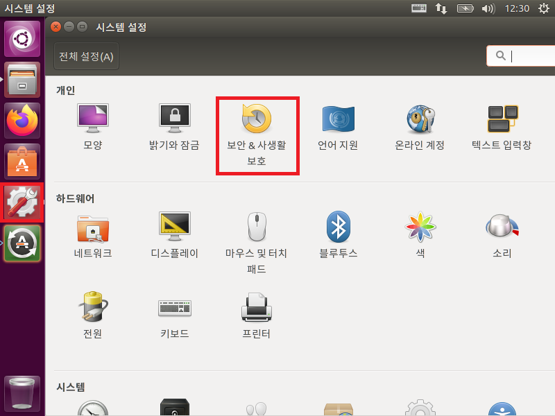 좌측 아이콘의 시스템 설정을 선택하여 생성된 창에서 보안 & 사생활 보호를 선택하면 다음과 같이 화면에 나타납니다.