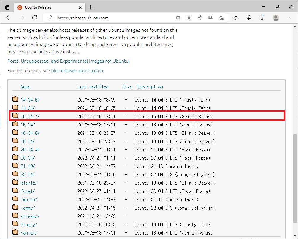 https://releases.ubuntu.com 에 접속하여 16.04.7을 다운받습니다.