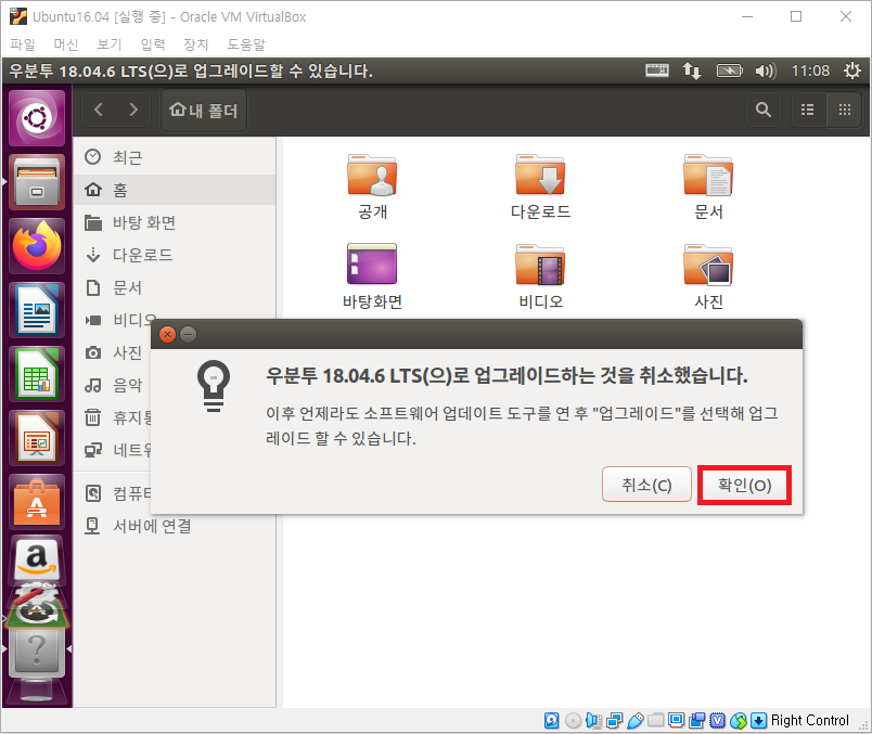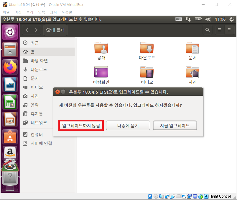Ubuntu를 최초 실행하면 이전 버전을 설치했으므로, 일정 시간이 지난 후 다음과 같이 업그레이드할 것인지를 묻습니다.
