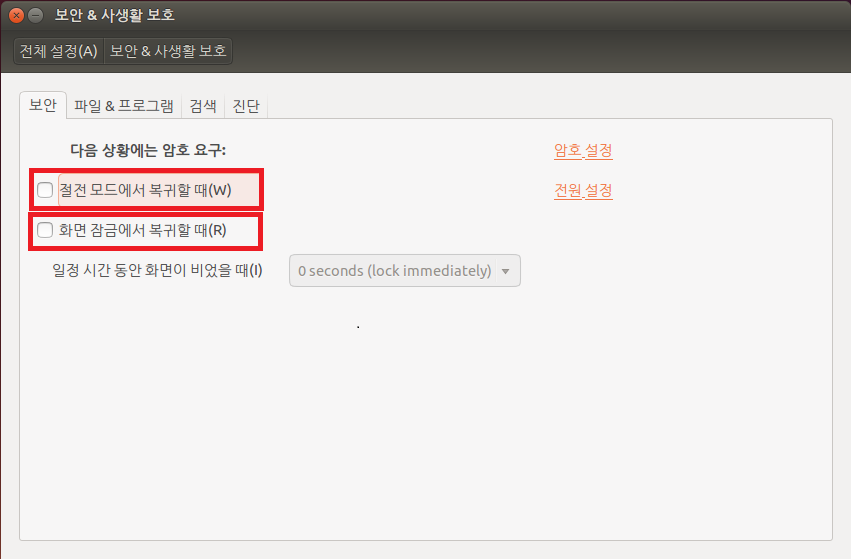 절전 모드에서 복귀할 때와 화면 잠금에서 복귀할 때 모두 체크를 빼면 됩니다.
