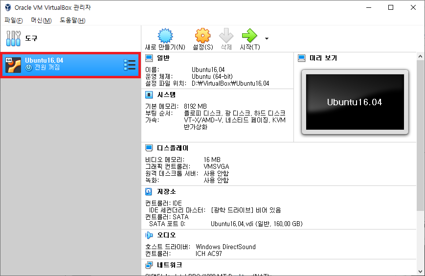 추가된 Ubuntu16.04를 마우스로 더블클릭을 하면 다음과 같이 화면에 나타납니다.