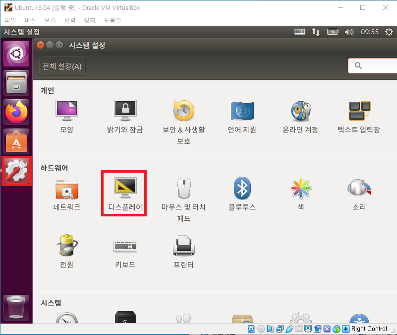 좌측 아이콘의 시스템 설정을 선택하여 생성된 창에서 디스플레이를 선택하고, 해상도를 1280*960로 변경하면 다음과 같이 화면에 나타납니다.