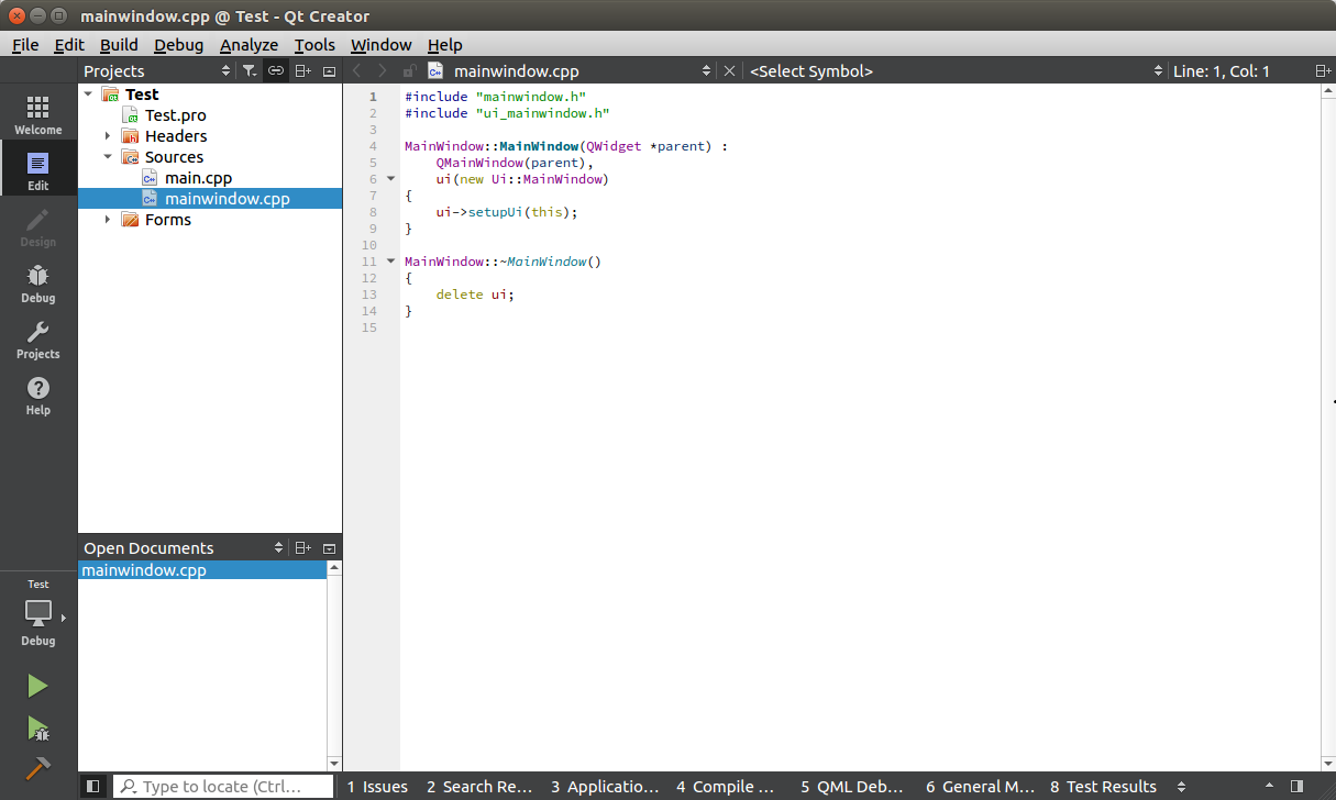 Finish를 클릭하면 다음과 같이 Qt Creator가 실행됩니다.