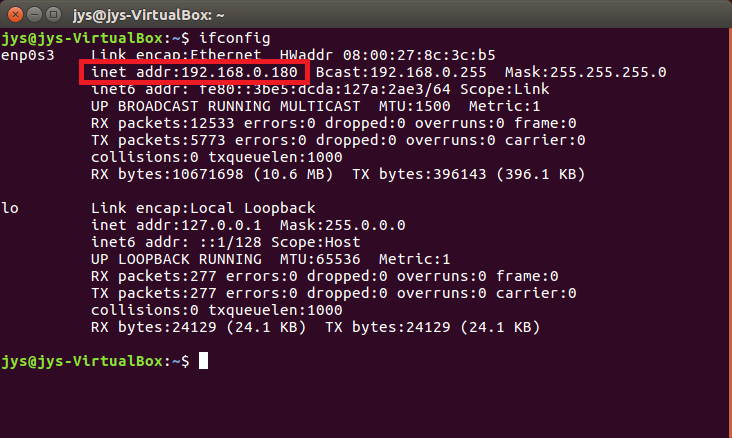 터미널에 ifconfig라고 입력하면 다음과 같이 네트워크 정보가 화면에 표시되는데 그 중 inet addr이 할당된 IP 주소입니다.