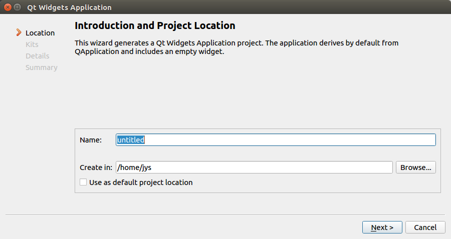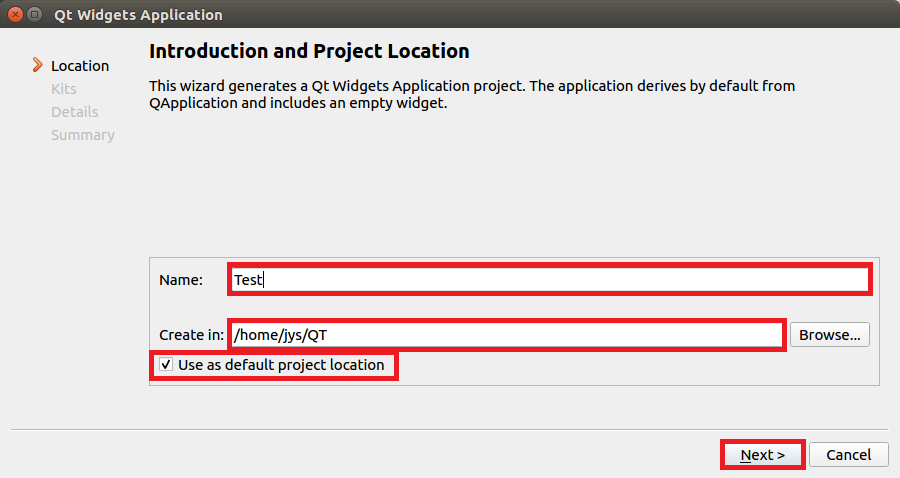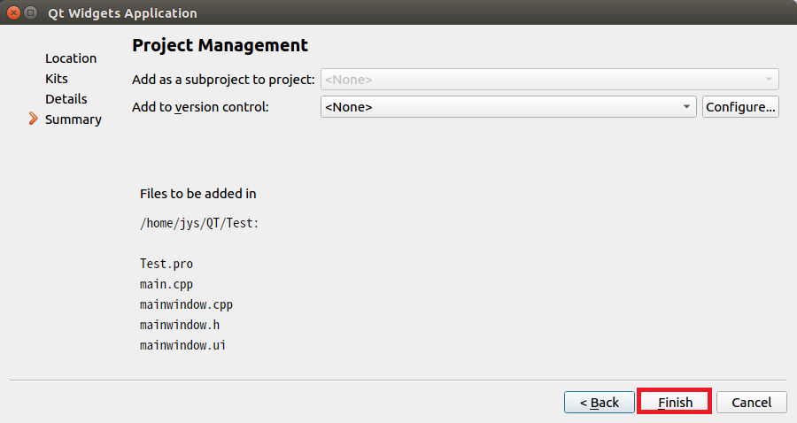 Name에서 Test를 입력하고 Create in에 /home/jys/QT를 입력합니다.