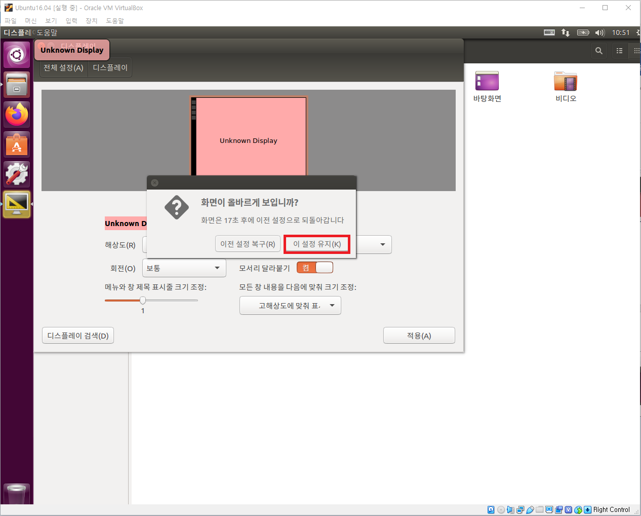 이 설정 유지를 클릭하면 해상도 변경이 완료됩니다.