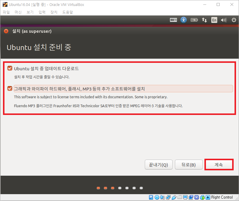 Ubuntu 설치를 선택한 후 나타난 화면에서 체크 박스를 모두 선택합니다.