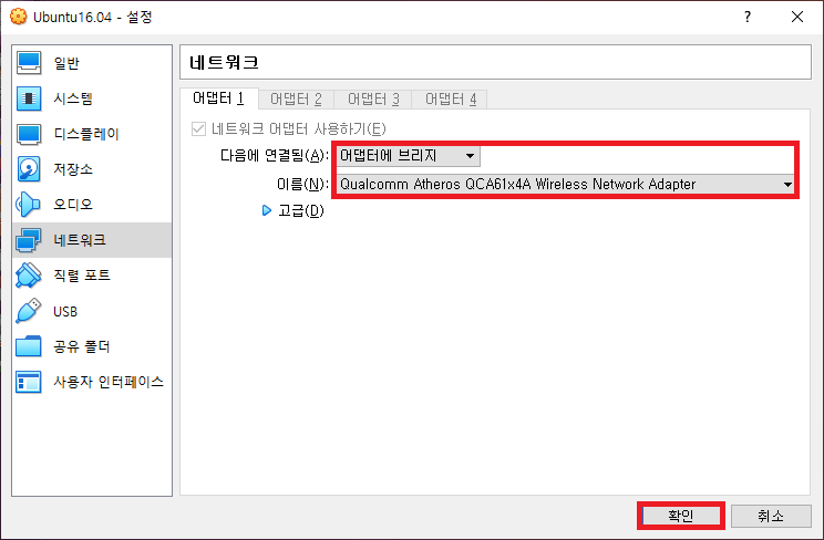 NAT를 다음과 같이 어댑터에 브리지를 선택하고 사용하고자 하는 네트워크 카드(가능하면 인터넷을 사용하는 네트워크 선택)를 선택합니다.