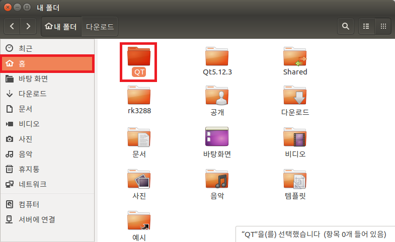 파일 탐색기를 띄워 홈을 선택한 후 마우스 오른쪽 버튼을 클릭하여 생성된 메뉴에서 새폴더를 선택하여 QT라는 폴더를 생성합니다.
