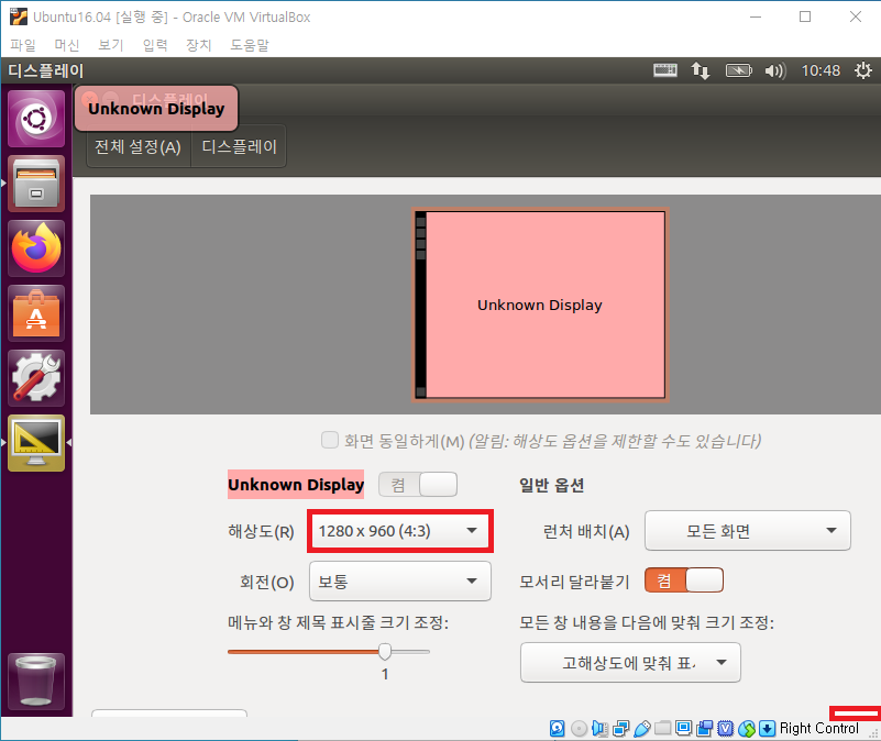 좌측 아이콘의 시스템 설정을 선택하여 생성된 창에서 디스플레이를 선택하고, 해상도를 1280*960로 변경하면 다음과 같이 화면에 나타납니다.