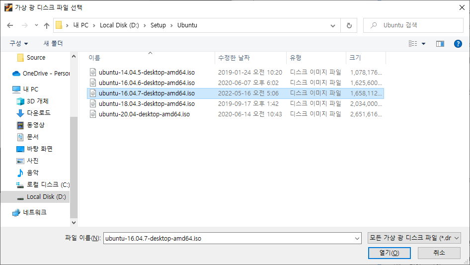 ubuntu-16.04.7-desktop-amd64.iso 파일을 선택하고 열기를 누르면 다음과 같이 화면에 나타납니다.
